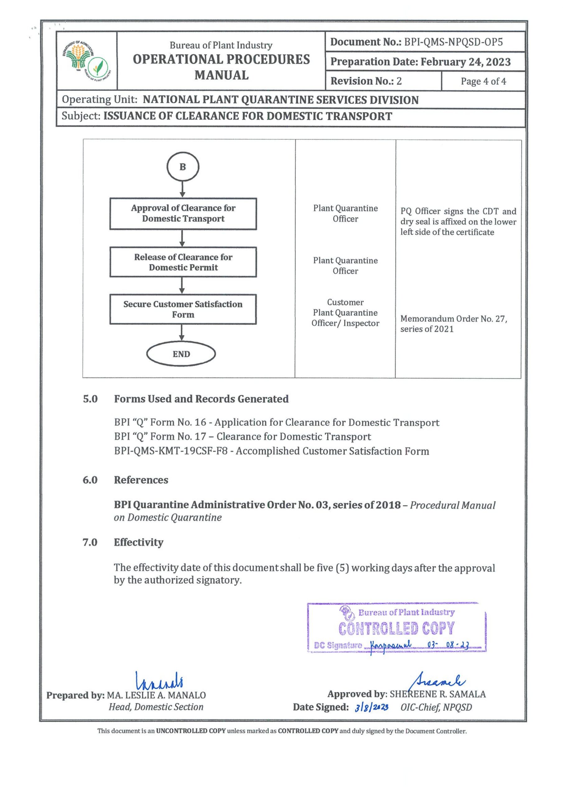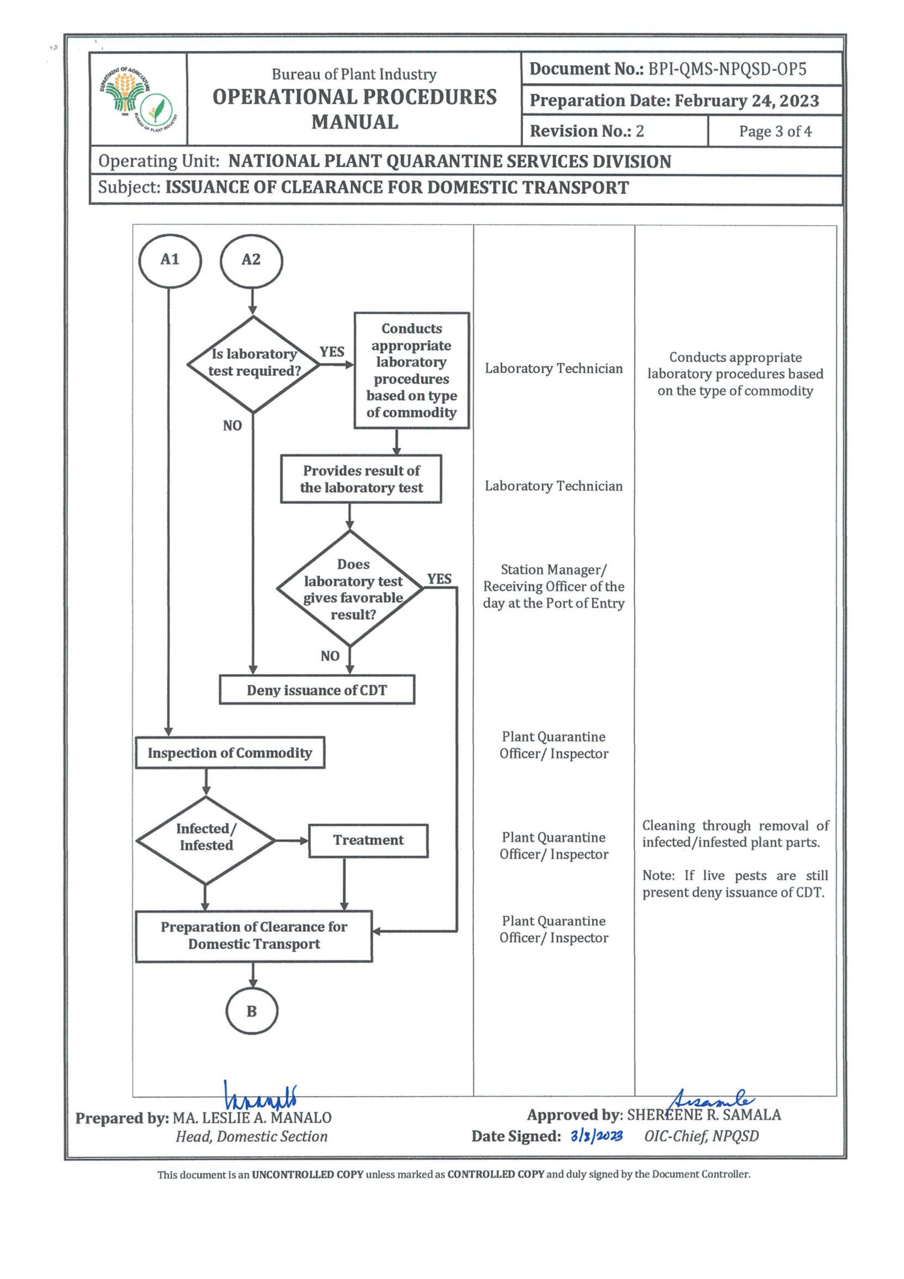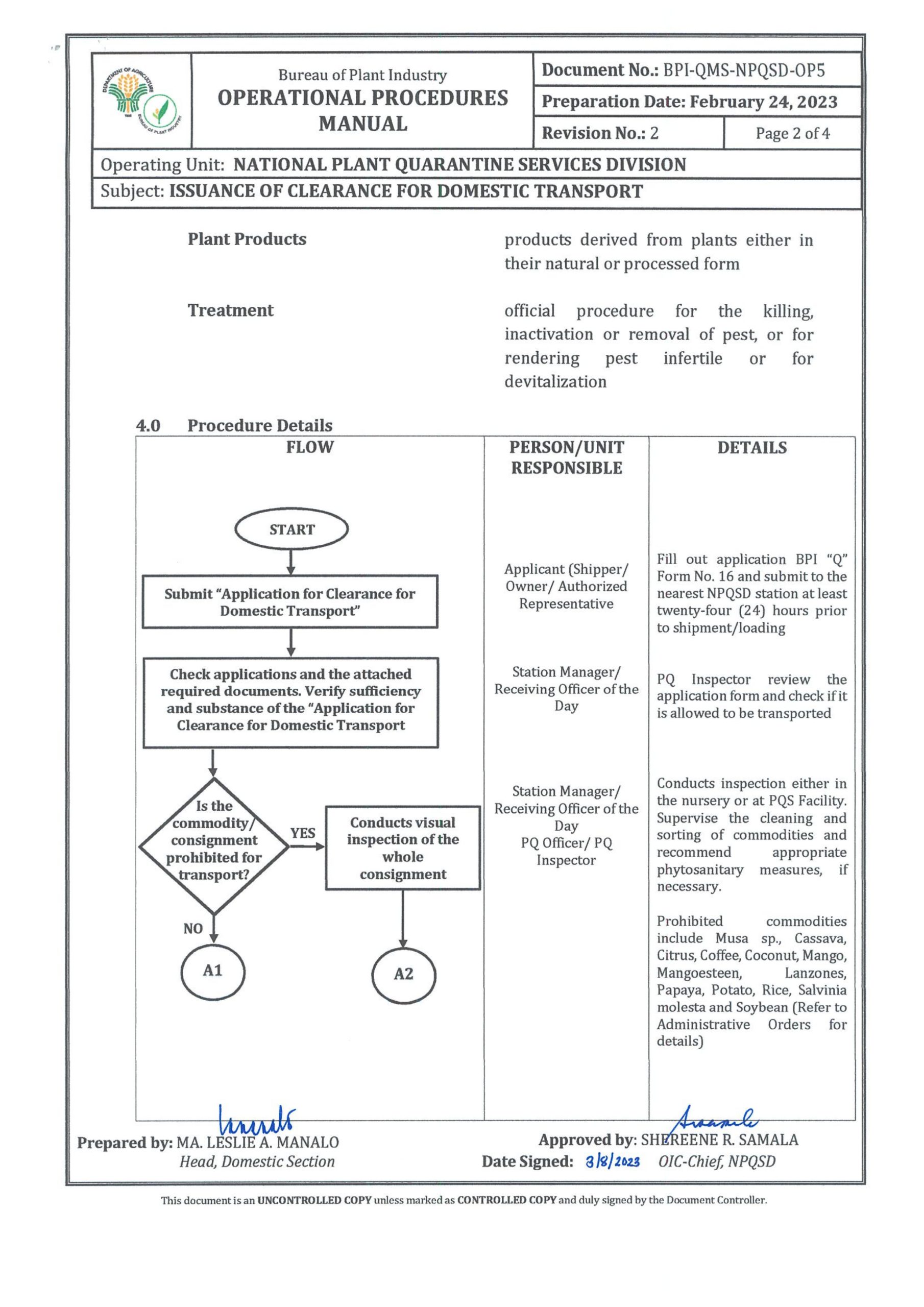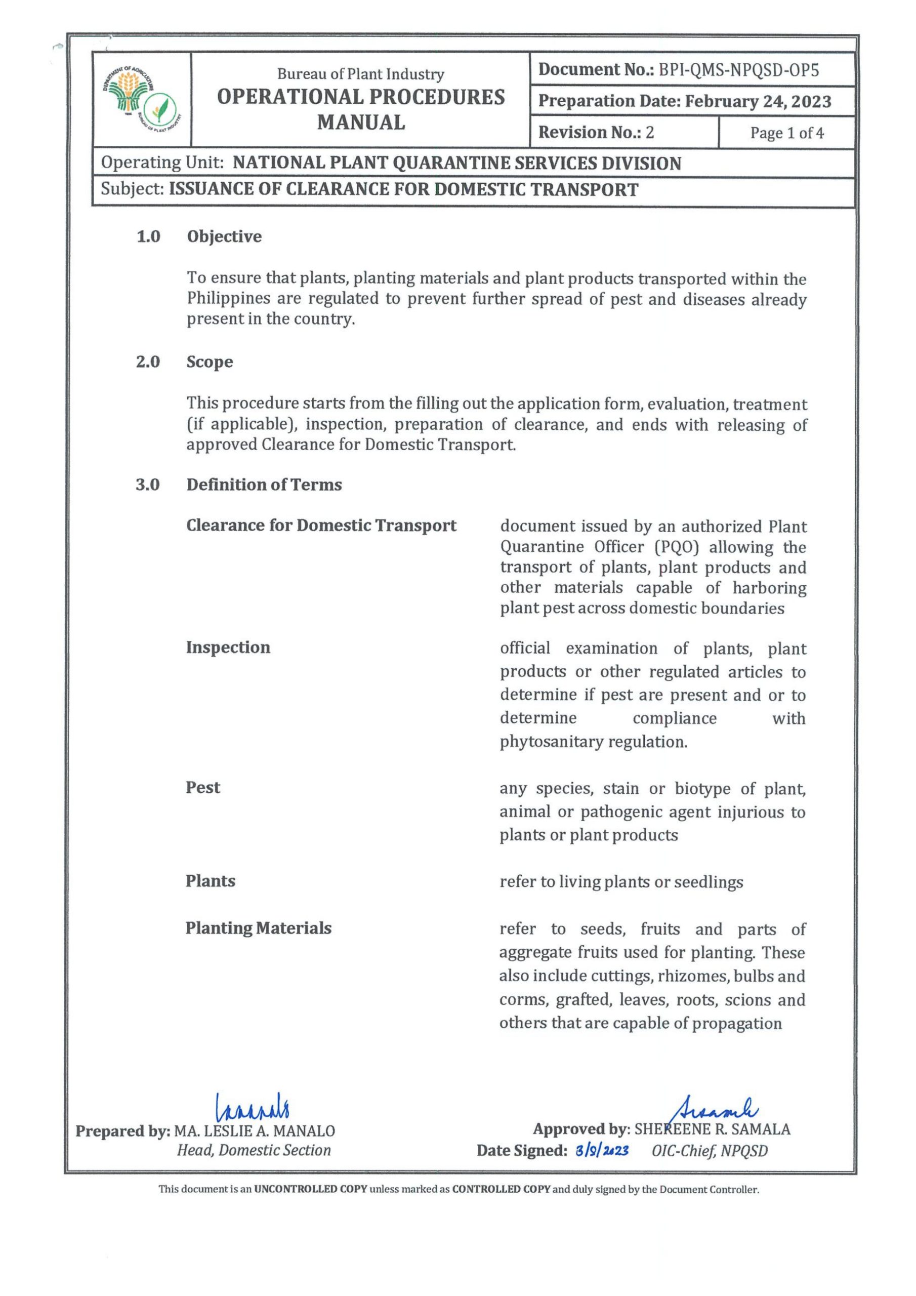 National Plant Quarantine Services (NPQS) shall issue Clearance for Domestic Transport (CDT) of Plants/Planting Materials/Plant Products within the country to ensure that injurious plant pests, primarily the regulated non-quarantine pests will not be introduced to other provinces and regions of the country. PQO and PQI shall stringently inspect the commodity/consignment and apply appropriate phytosanitary measures, if necessary, before allowing transport to another region or province.